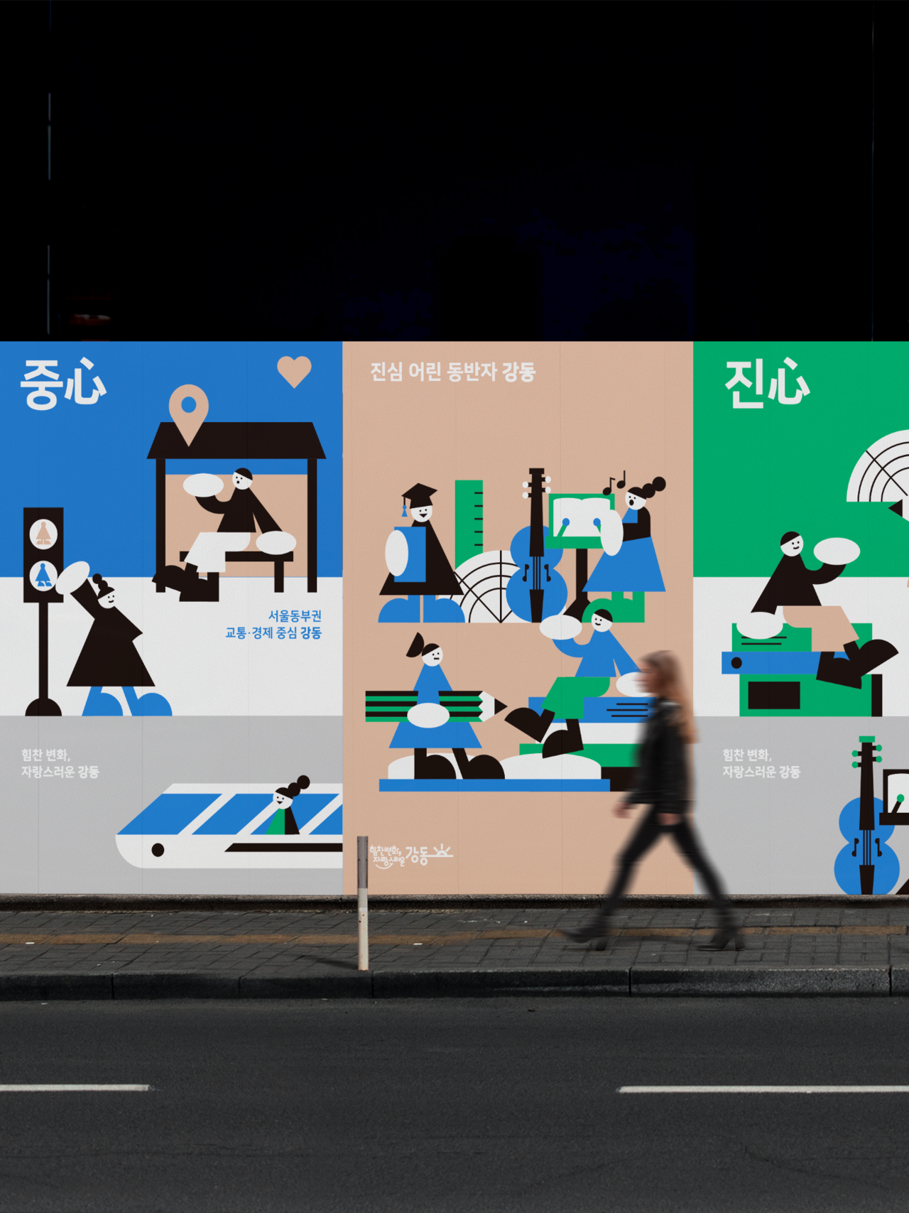 A Temporary Fencing Design Project for Gangdong-gu Office. The design for temporary fencing was developed based on the Grand Design of Gangdong-gu District, aimed at creating a unique urban landscape. The design integrates works by emerging local artists and conveys messages from the Gangdong-gu District.