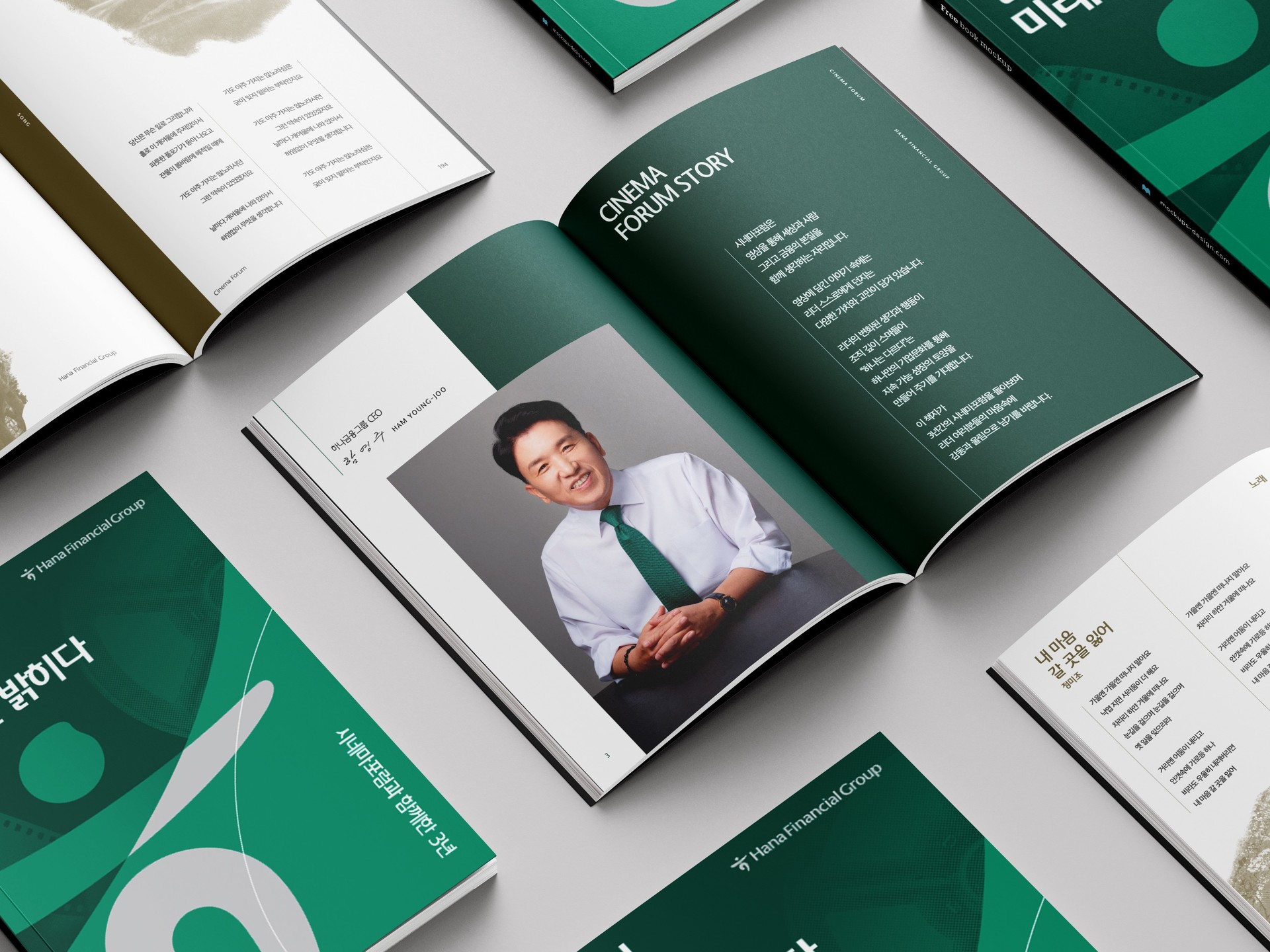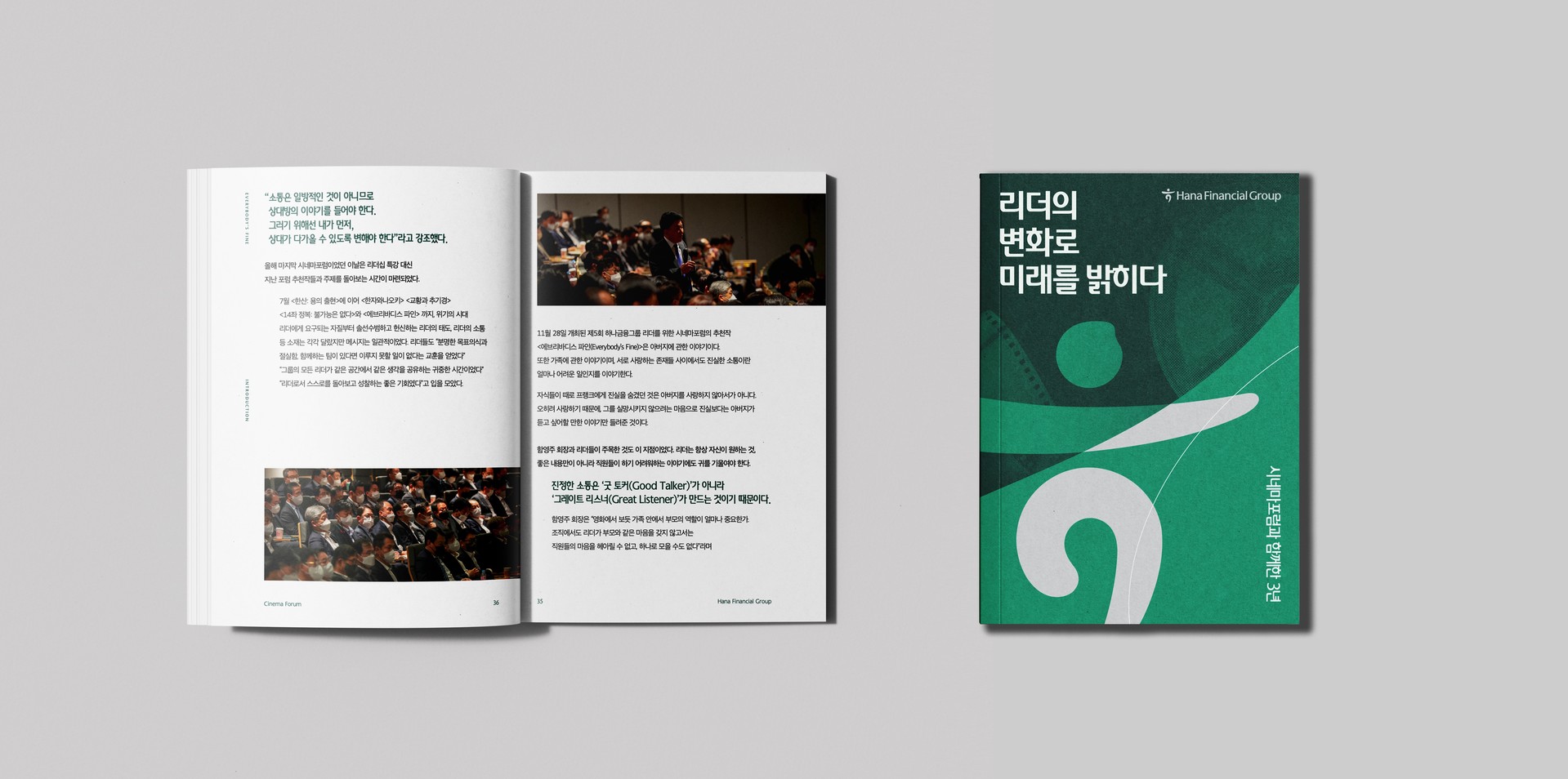 We designed a booklet containing the content of Hana Financial Group's leadership enhancement program 'Cinema Forum.' We systematically compiled the content from the past three years of the program's operation, aiming to effectively convey messages about leadership.